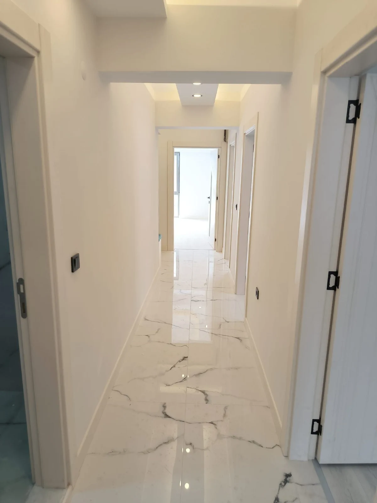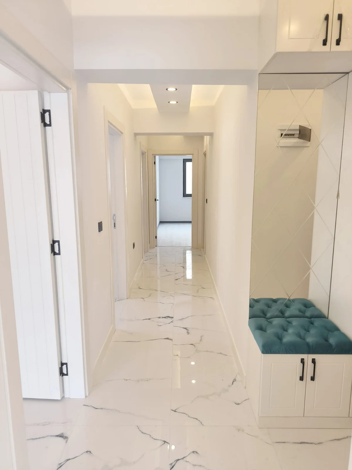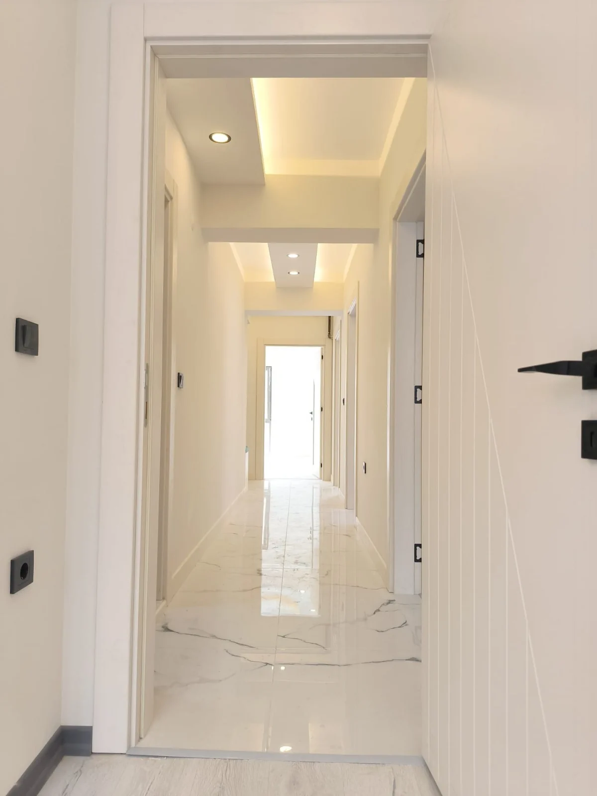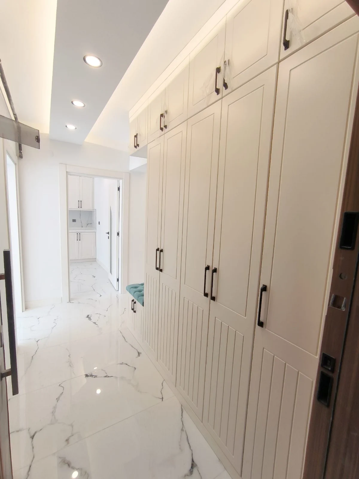 Estetik Aydınlatma Tasarımı: Salon, koridor, mutfak ve ebeveyn yatak odasında uygulanan özel ışık bariyeri ve spot aydınlatma sistemleri ile modern bir ambiyans.