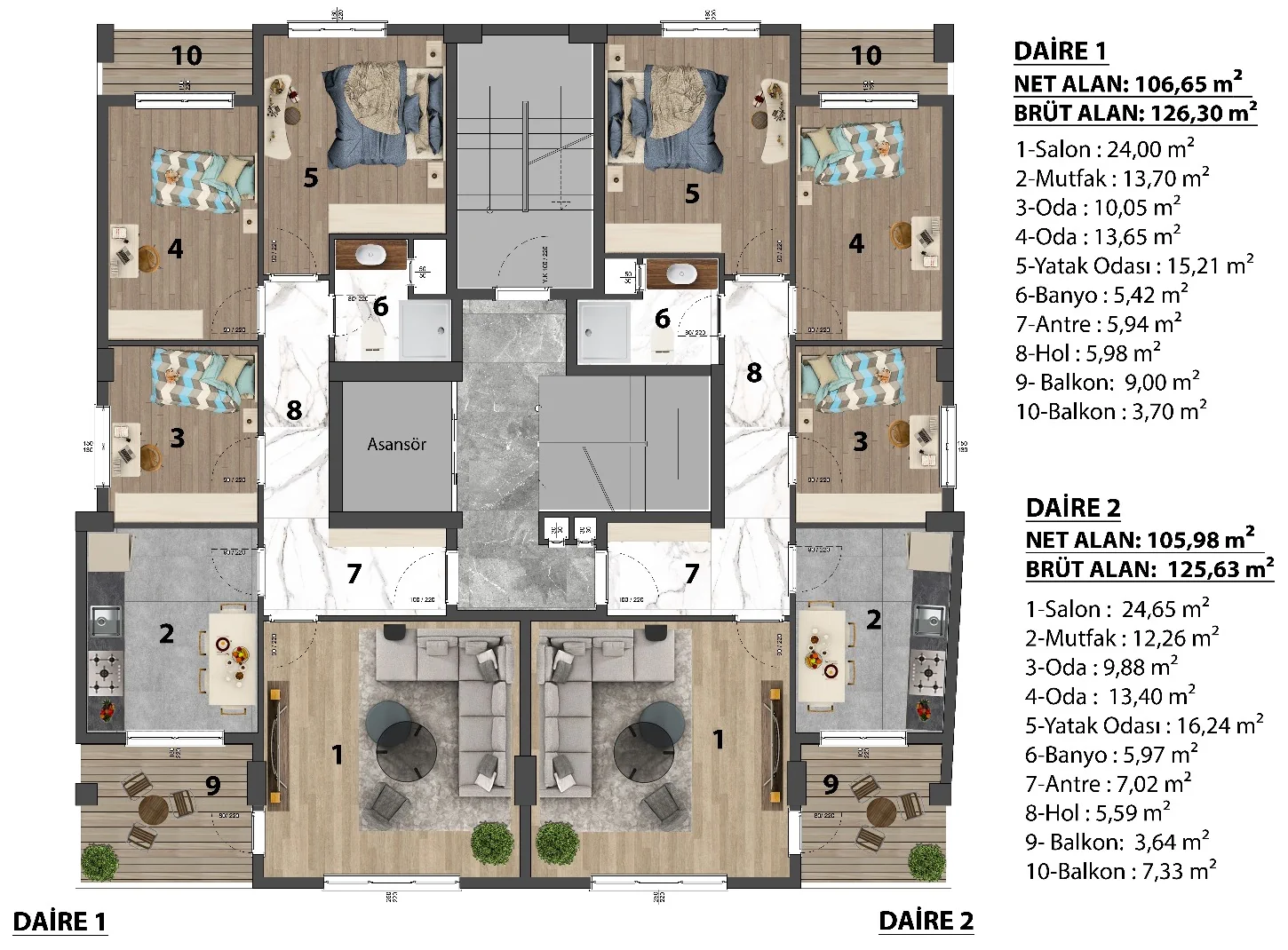 Dairelerimiz net 105 m², brüt 125 m² genişliğindedir.
