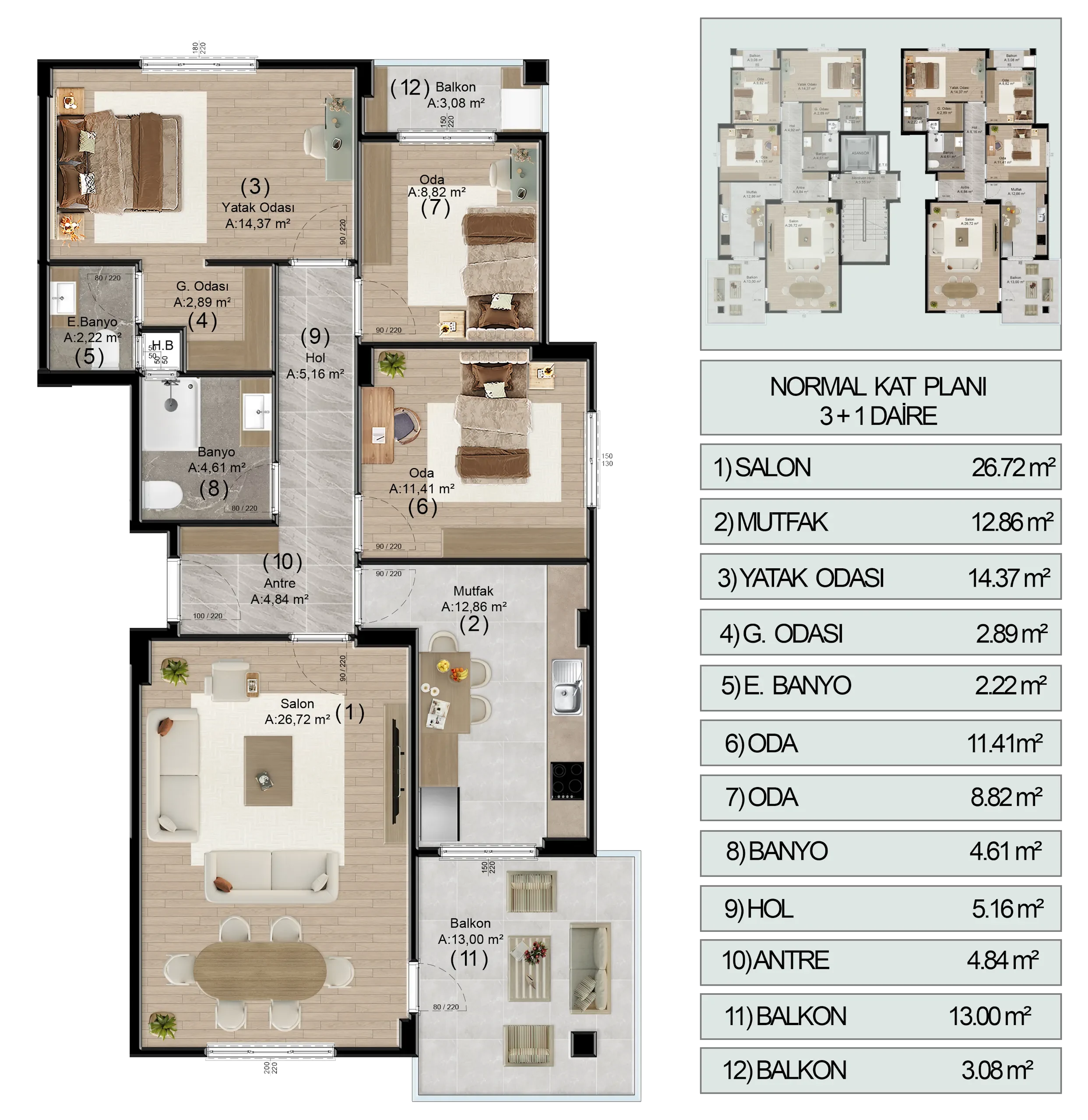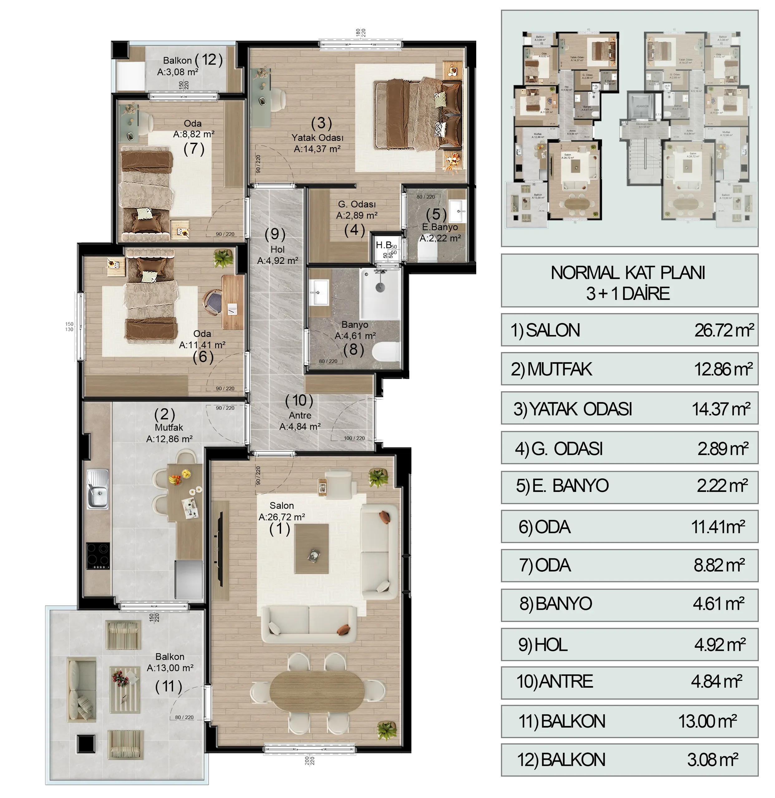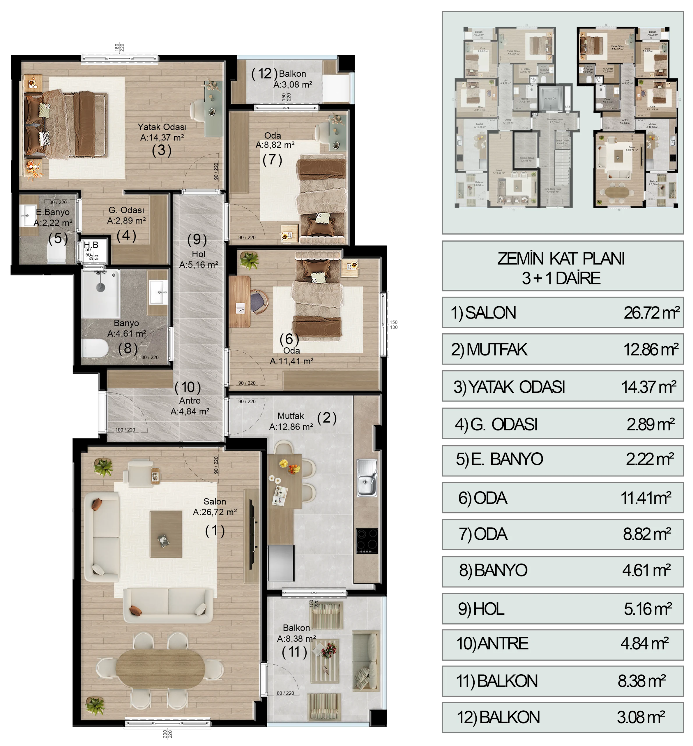 Bu daire tipimiz, aile yaşamının tüm gereksinimlerini karşılamak üzere fonksiyonel mimari ve yüksek malzeme kalitesiyle tasarlandı.