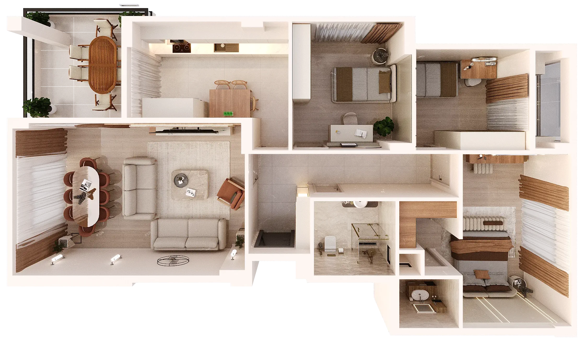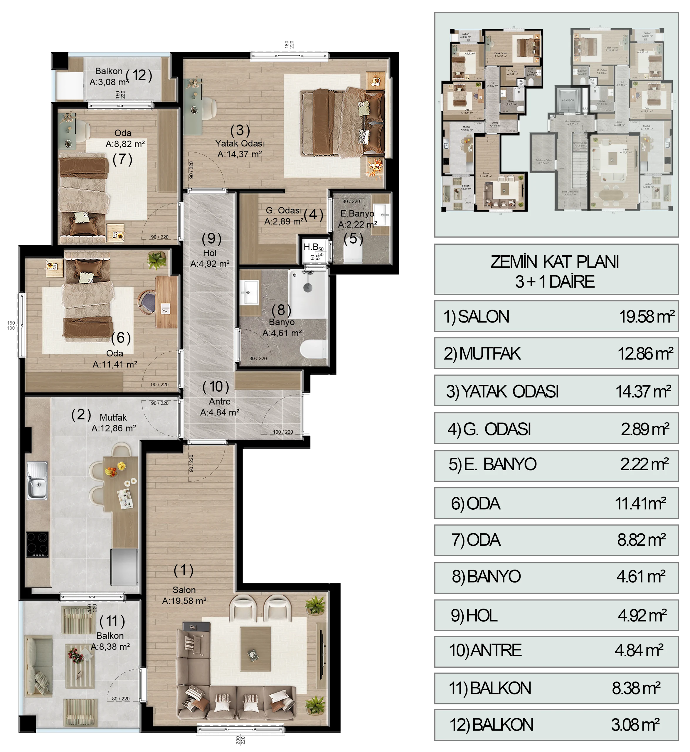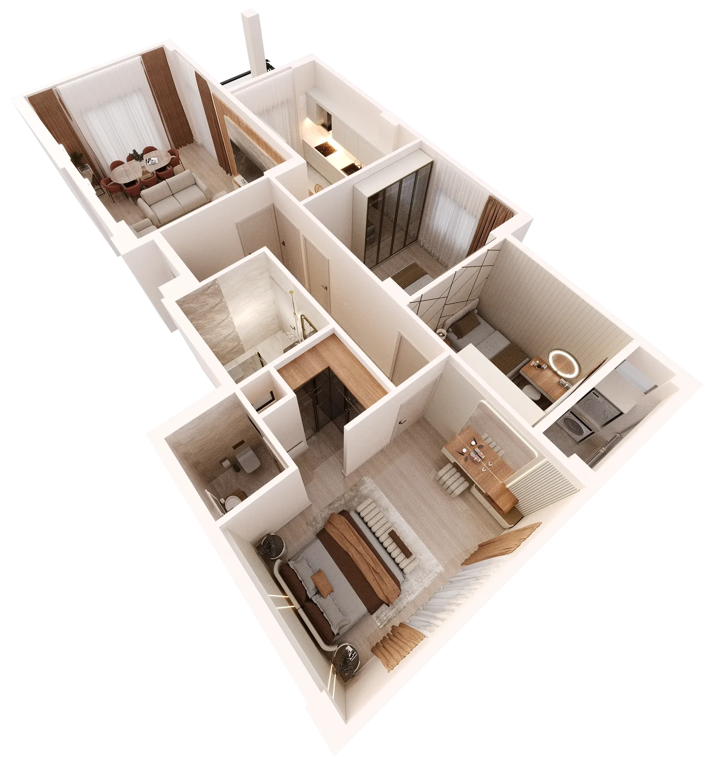 Bu daire tipimiz, aile yaşamının tüm gereksinimlerini karşılamak üzere fonksiyonel mimari ve yüksek malzeme kalitesiyle tasarlandı.