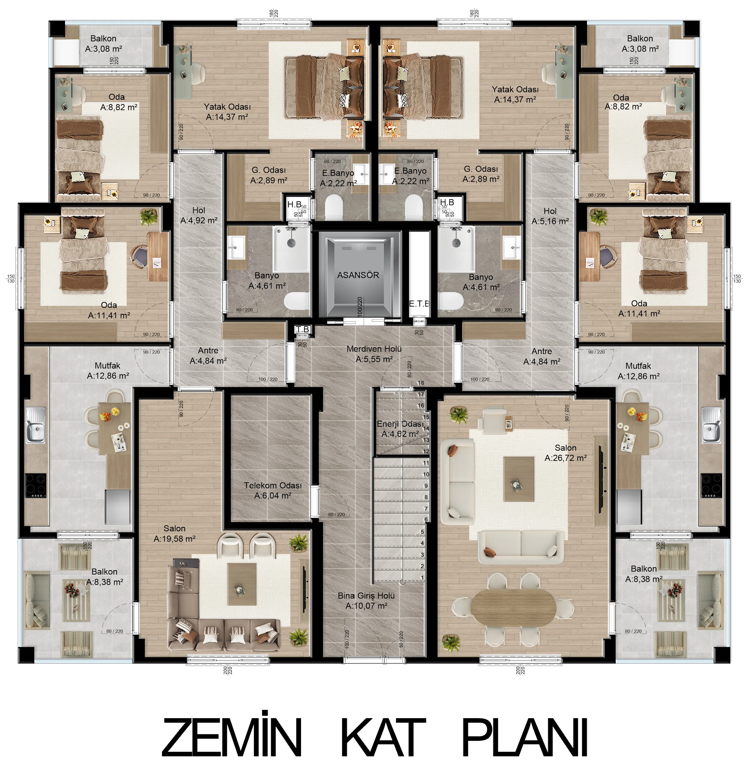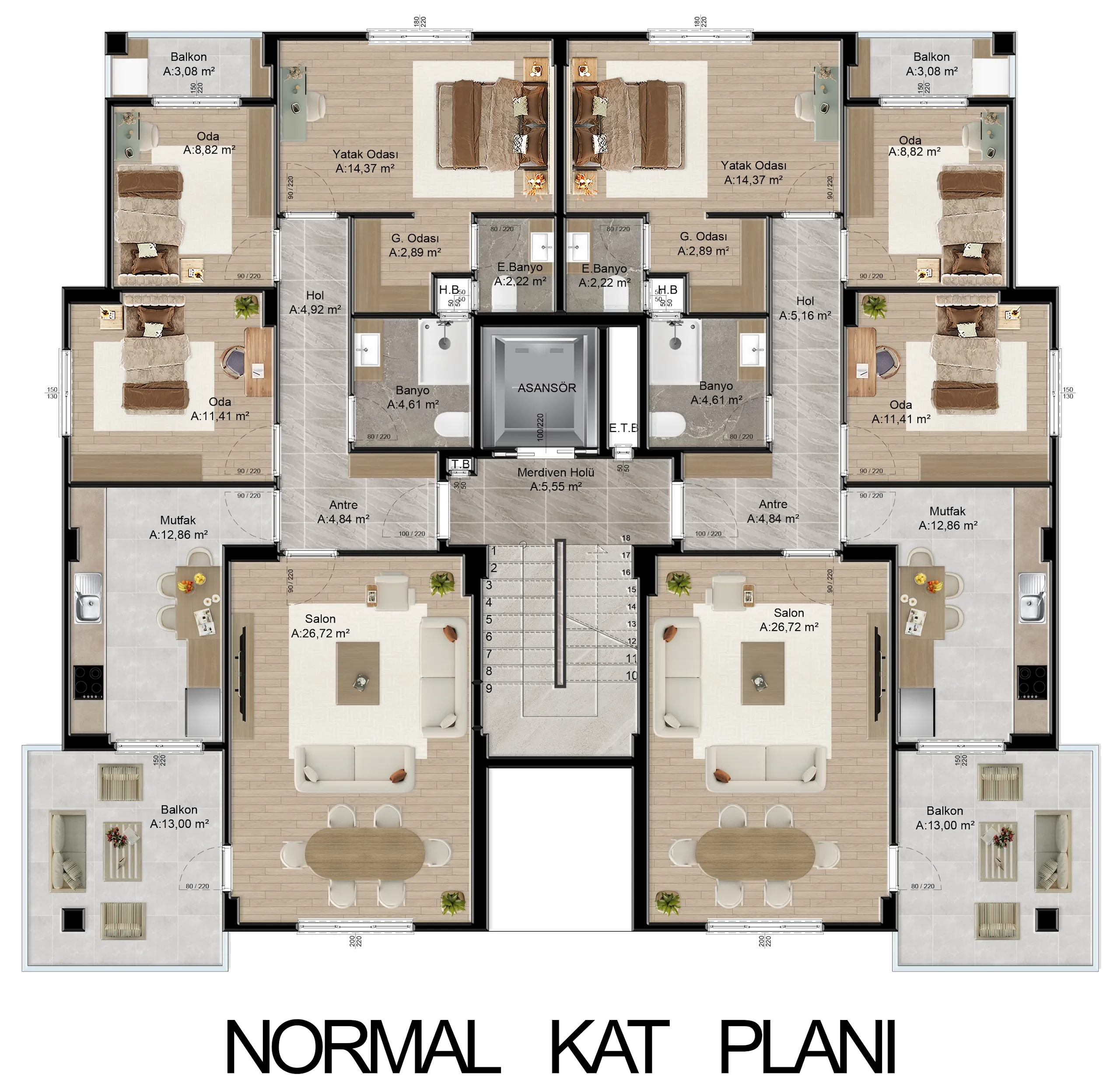 Tüm dairelerimiz net 125 m², brüt 145 m² genişliğindedir.